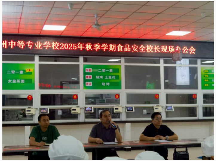 9 月 17 日,学校在食堂一楼召开食品安全校长现场办公会,围绕 “保障安全、提升质量,切实做好后勤保障工作” 主题,通过实地检查与现场会议相结合的形式,全面排查后勤服务隐患,部署整改提升任务。党委副书记、校长贾相成、分管副校长向珏、后勤保障科成员、食堂和超市全体员工参加会议,会议由向珏主持。