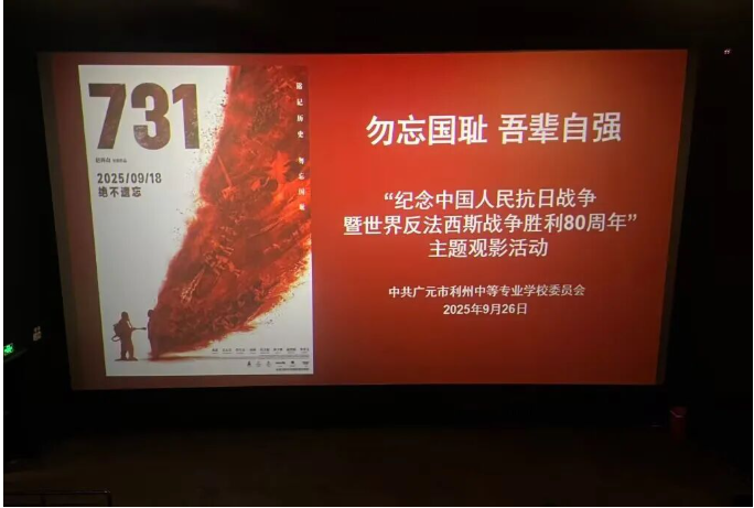 为纪念中国人民抗日战争暨世界反法西斯战争胜利80周年,深切缅怀先烈,弘扬爱国主义精神,9月26日,利州中专组织全体党员干部、民主党派人士开展“勿忘国耻?吾辈自强”主题观影活动,集体观看历史题材电影《731》,接受深刻的党性教育与精神洗礼。