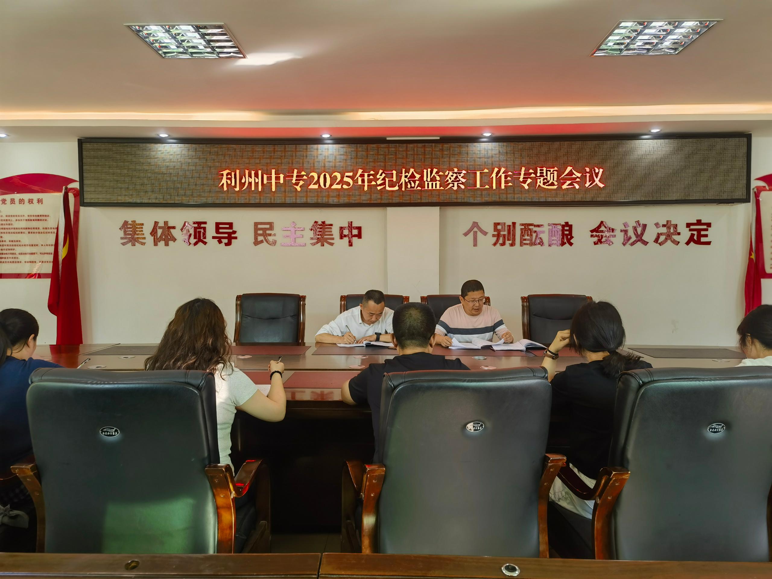 为深入贯彻落实全面从严治党战略方针,整合监督资源,凝聚监督合力,切实提升学校党风廉政建设和反腐败工作水平,9月25日下午,利州中专召开2025年纪检监察工作专题会议。市纪委监委驻利州中专纪检监察组干部、学校纪委委员、各党支部纪检委员参加会议?;嵋橛裳5澄笔榧墙鞒?。